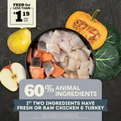 - The balanced recipe contains up to 60% high-quality animal ingredients and 40% wholesome fruits and vegetables, plus added vitamins, minerals and probiotics.