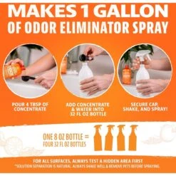 - Concentrate bottle makes 1 gallon or 4 32-ounce spray bottles of pet odor remover.
