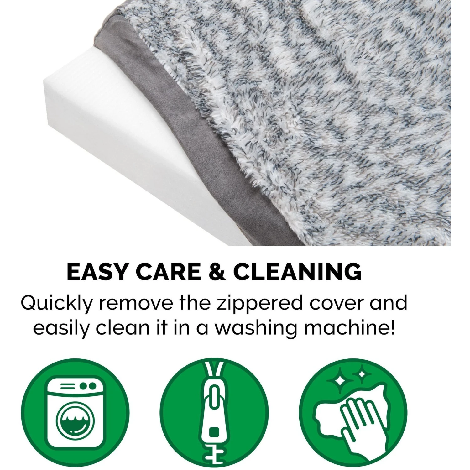 Give your best friend the support they need with a luxuriously soft FurHaven Two-Tone Faux Fur & Suede Deluxe Orthopedic Mat pet bed. Solid orthopedic foam provides your pet with extra support and cushioning for maximum comfort. This full support solid slab orthopedic foam provides even more support and comfort. Your pet will benefit from the orthopedic foam which is designed to evenly distribute weight and alleviate painful pressure on muscles and joints. Better rest for your pet can lead to improved overall health. Easy step-on mat design for smaller, older or disabled pets. The cover is zippered and removable for easy machine-washing, while the foam core is hand wash. This pet bed is ideal for bigger dogs (or smaller dogs to share) who like to sprawl & snooze the day away.