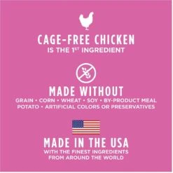 - Proudly made in the USA free from grains, potato, corn, wheat, soy, by-product meal or artificial colors or preservatives.