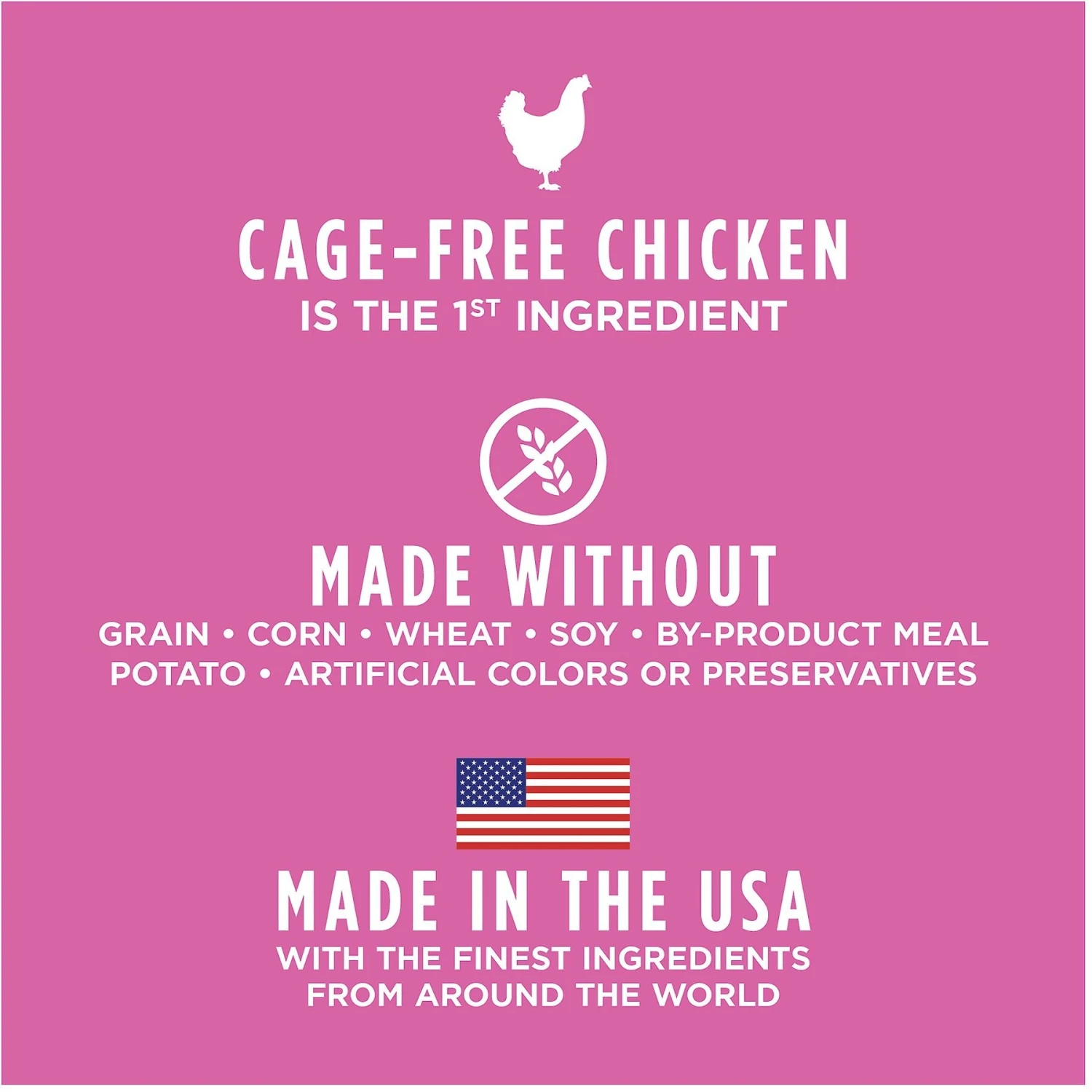 - Cage-free chicken is the first ingredient so it’s packed with animal protein for strong, lean muscles. Plus, it has the ideal balance of protein, fat and calories.