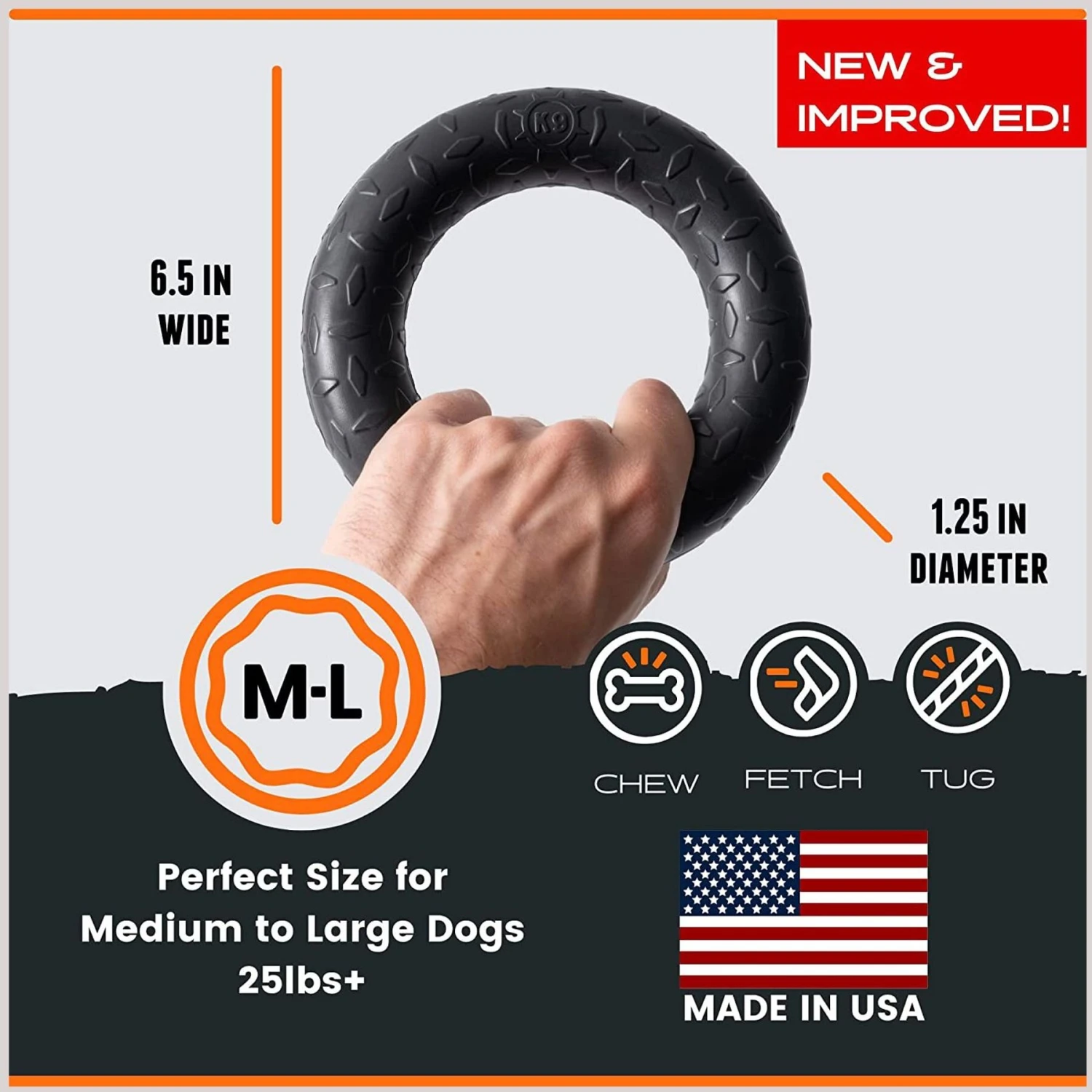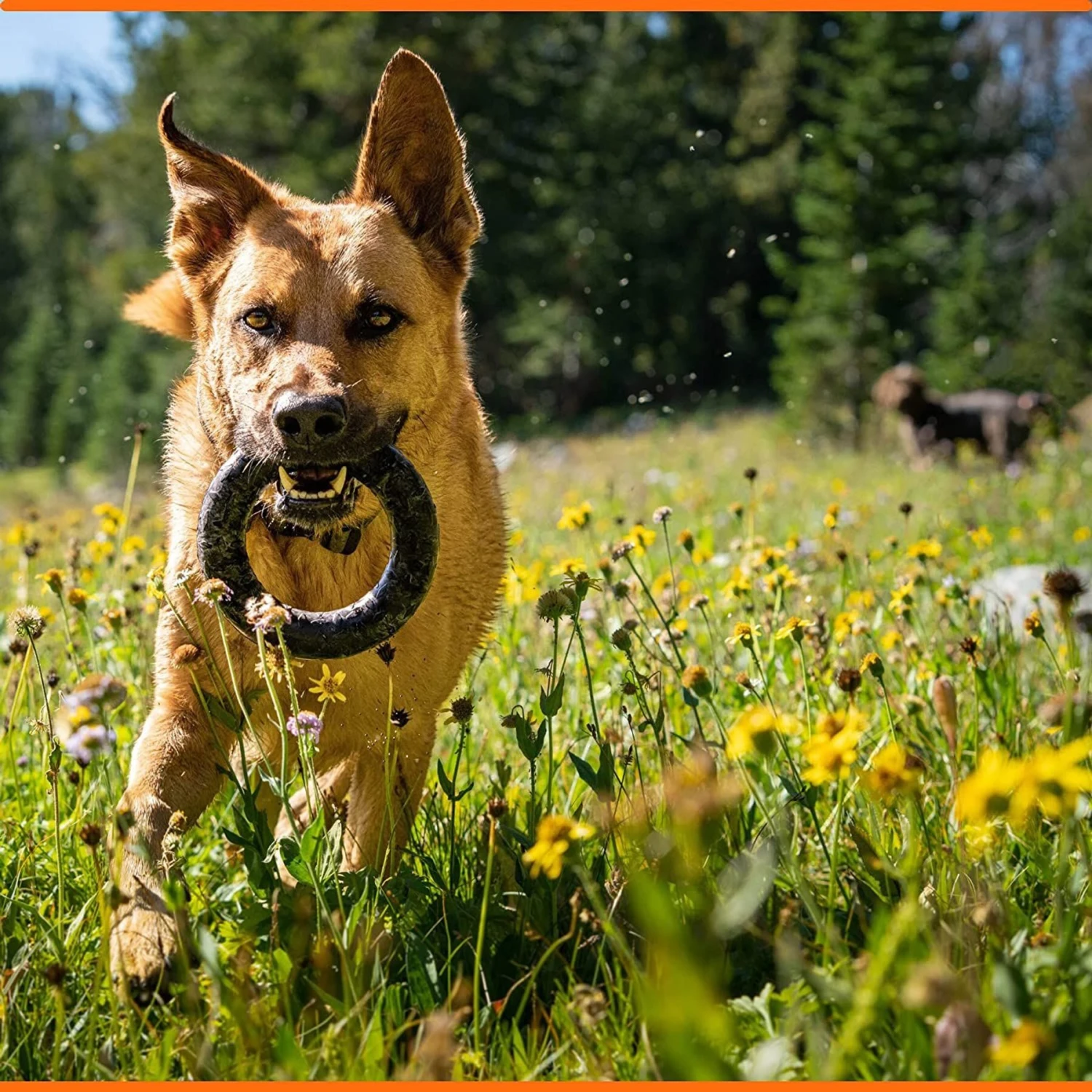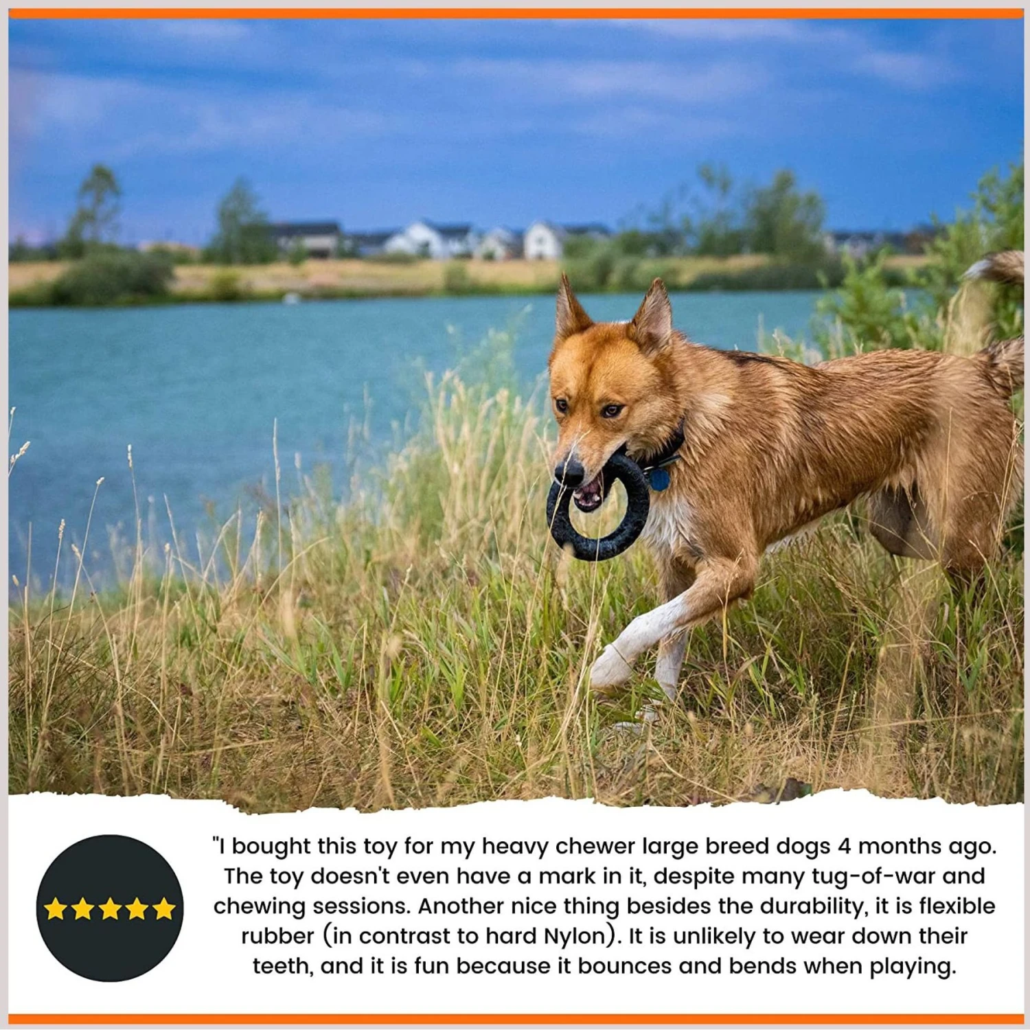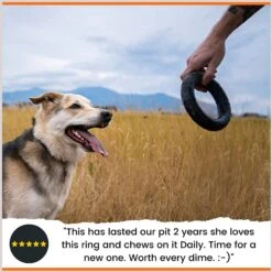 - Durable ring toy that stands up to rough play.