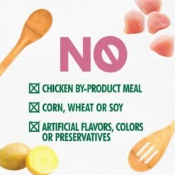 - Formulated without corn, wheat, soy, chicken by-product meal, artificial colors, flavors, or preservatives.