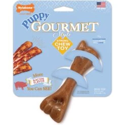 Make playtime a delightfully chewy and gourmet experience for your pup with Nylabone Puppy Gourmet Style Strong Chew Femur Bacon Flavored Dog Toy! Made in the USA, this chew toy is made with durable materials and is shaped like an adorable bone. It is studded with exquisite bits of bacon that have been slow roasted for a delicious, gourmet flavor! Each chew toy gives your pup hours of chewing fun, making it paw-fect for teaching young puppies healthy chewing behaviors. It is intended for puppies who enjoy a good long-lasting chew.