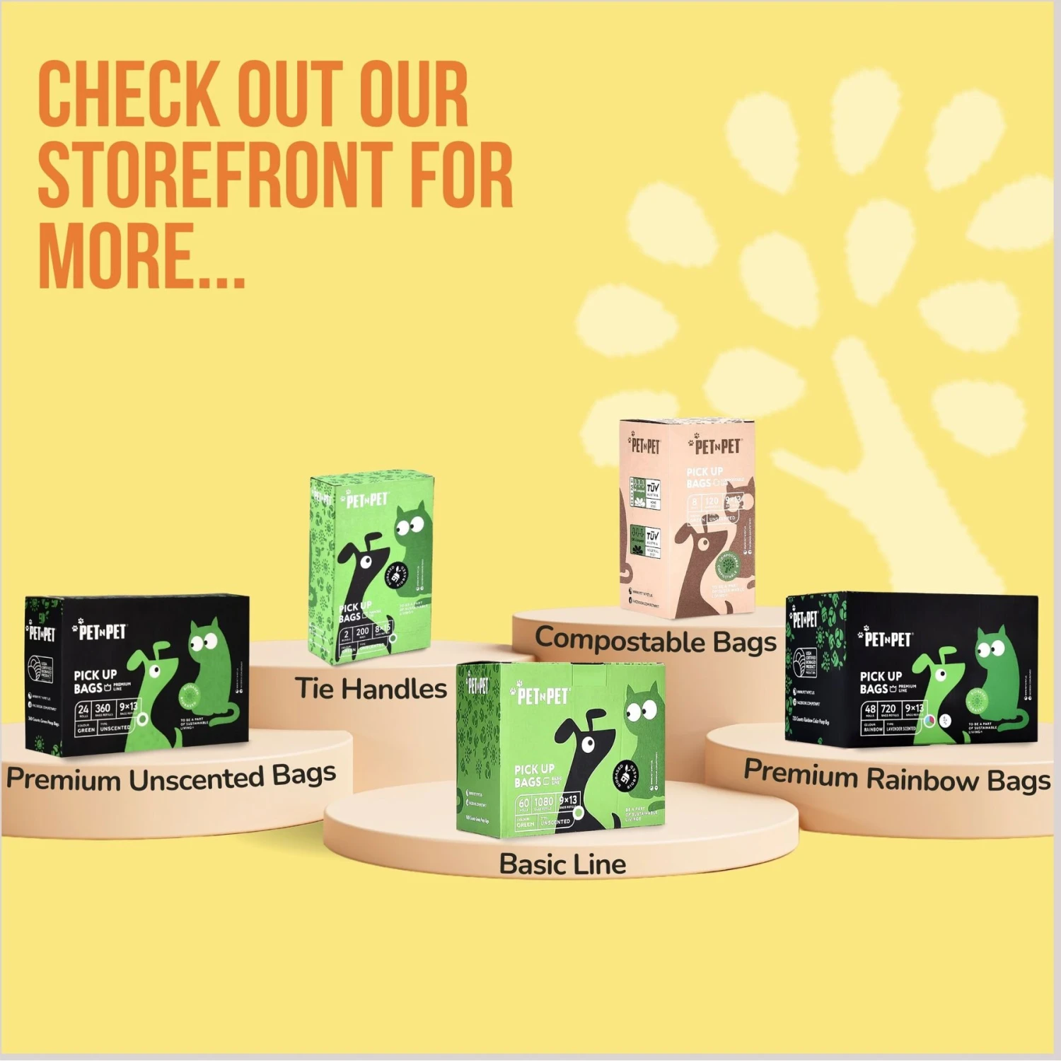 - PET N PET doggie poop bags have a tear perforation and an “Open” arrow, making them easy to tear off, open and detach from the roll.