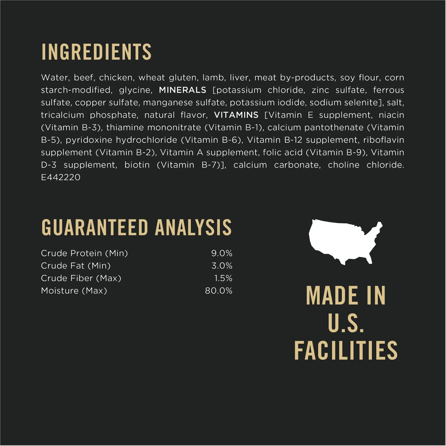 - This beef and lamb dog food with gravy is proudly manufactured at Purina-owned, U.S. facilities with no artificial colors or preservatives.