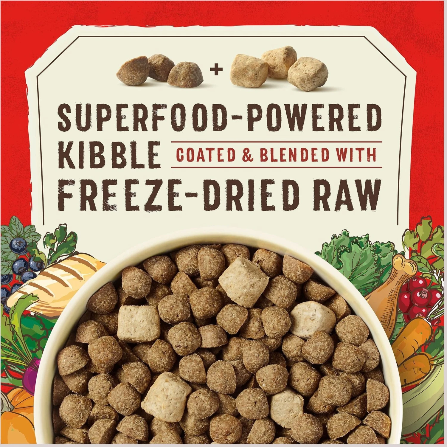 - This raw-coated, nutrient-packed kibble is crafted with a unique blend of responsibly sourced proteins, grains and superfoods.